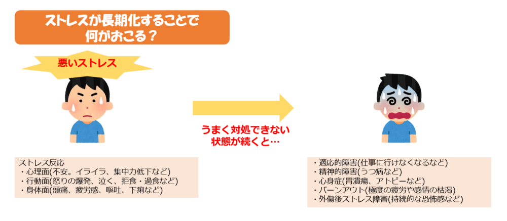 気をつけないといけないのは、うまく対処できないストレスが長期間続くことです。ストレス障害と呼ばれるさまざまな障害や疾病に進むことが懸念されます。